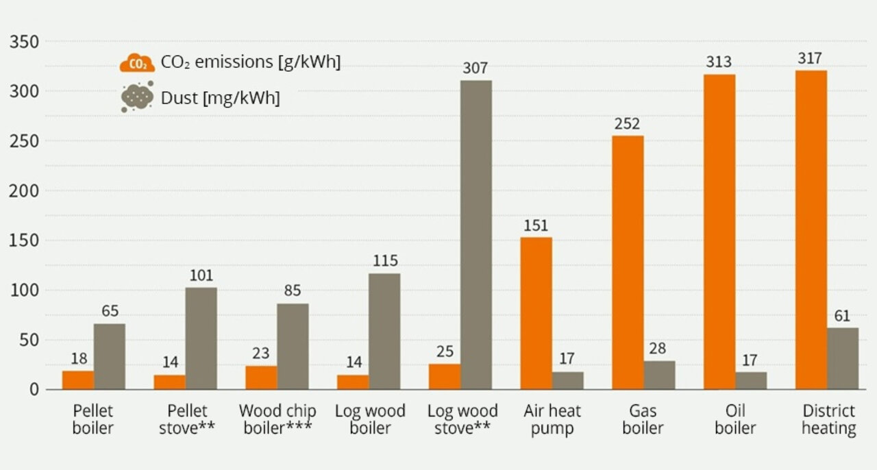 A pellet heating system is currently the heating system with the lowest CO2 emissions compared to a heat pump, gas heating, or district heating.
