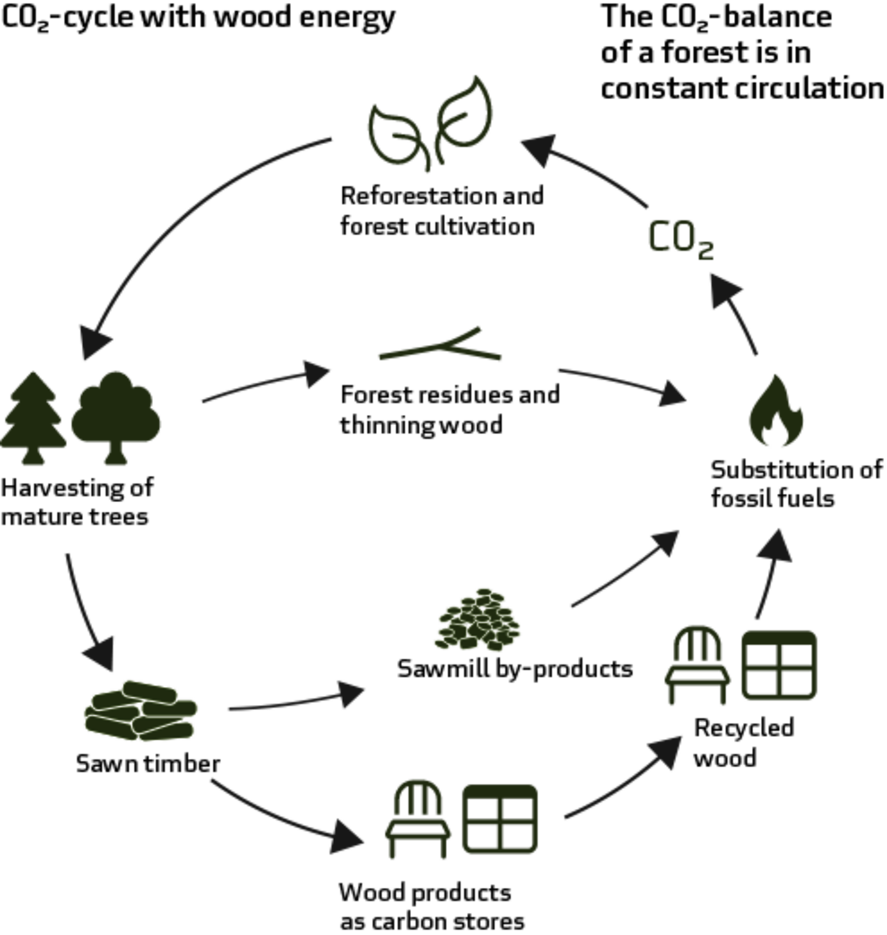 Depending on the tree species and yield, 50-80% of the wood is used for material purposes after harvesting, e.g. in wood construction, materials, insulation, etc. These wood products continue to serve as carbon storage. About one-third can be used for energy: The carbon is released in the exact amount that the tree absorbed during its growth. Therefore, it does not contribute to the CO2 enrichment in the atmosphere. On the contrary, the use of wood pellets for heat supply saves and avoids emissions from fossil sources (coal, oil, gas).