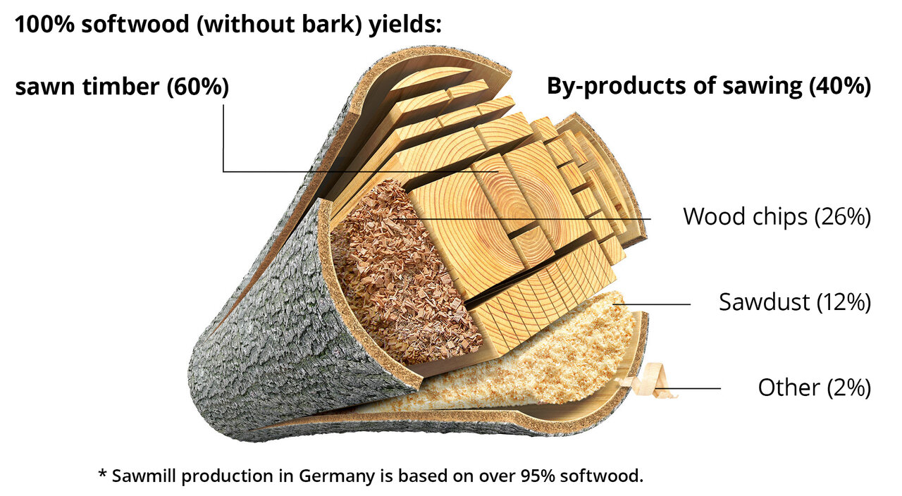 Even residual wood from logging and thinning, such as crown and weak wood, as well as storm, damaged, or crooked wood, which is no longer suitable for processing in the sawmill, can be processed for pellet production. High-quality lumber is not processed into pellets, as the highest value added in the sawmill is in the lumber. The sole processing into wood pellets would be uneconomical. The material use of wood as a building material and its energetic use for heat supply are not in competition, but rather mutually dependent. Energy wood is a by-product of sustainable forestry and wood industry: If it is not used, it rots in the forest without achieving CO2 reduction!