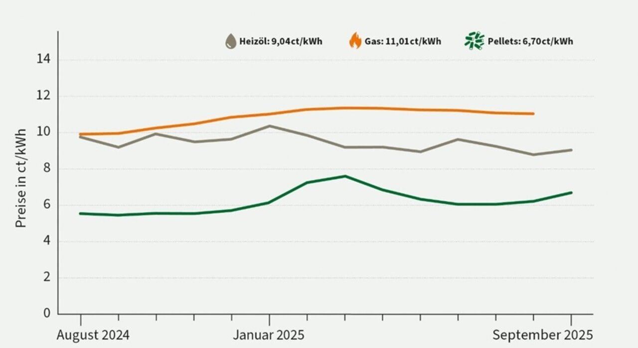 Der Preis von Pellets liegt seit Jahren deutlich unter dem von Öl und Gas. Durch die CO₂-Bepreisung fossiler Energien werden diese in den kommenden Jahren ansteigend teurer.